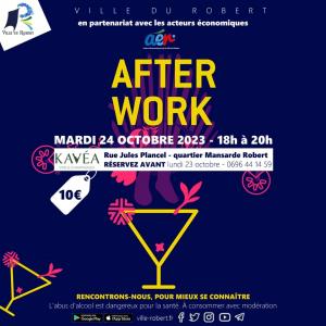 La ville du Robert en partenariat avec l'association des Acteurs Economiques du Robert propose aux chefs entreprises de la commune un AFTER WORK LE MARDI 24 OCTOBRE 2023 chez KAVEA (rue Jules Plancel à Mansarde) de 18h à 20h - Tarif : 10€ - Réservez avant lundi au 0696 44 14 59
