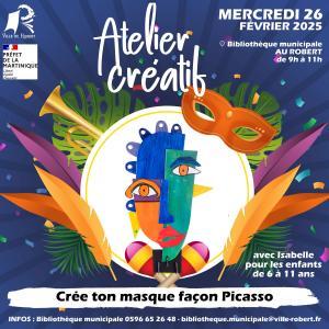 La bibliothèque municipale du Robert vous propose un atelier créatif "CREE TON MASQUE FACON PICASSO" pour les enfants de 6 à 11 ans animé par Isabelle le mercredi 26 février 2025 à la bibliothèque de 9h à 11h.