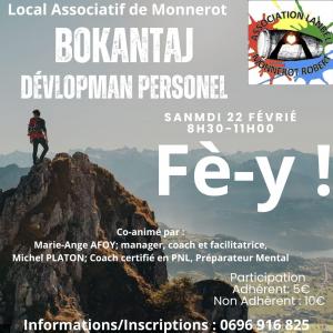 L'association Lanbeli vous propose BOKANTAJ DEVLOPMAN PERSONEL samedi 22 février 2025 de 8h30 à 11h au local associatif de Monnérot au Robert