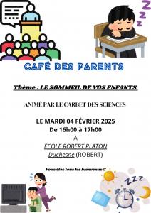 L'école Robert PLATON de Duchesne vous convie au "CAFÉ DES PARENTS" une conférence sur le thème du sommeil de vos enfants, animé par "LE CARBET DES SCIENCES" le Mardi 04 février 2025 de 16h00 à 17h00.
