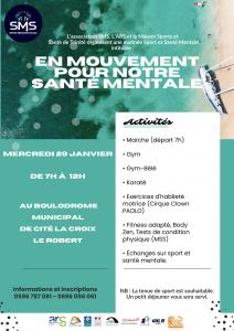 L'association Service Médiation Sociale en partenariat avec la Maison Sports et Santé de  Trinité organise une matinée sport et santé mentale : "En mouvement pour santé mentale" mercredi 29 janvier 2025 de 7h à 12h au boulodrome municipal de Cité La Croix au Robert.