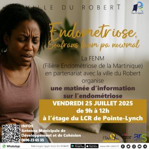 La FENM (Filière Endométriose de la Martinique) en partenariat avec la ville du Robert organise une matinée d’information sur l’endométriose vendredi 25 juillet 2025 de 9h à 12h à l’étage du LCR de Pointe-Lynch.