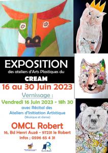 Le président de l'Office Municipal de la Culture et des Loisirs du Robert vous invite vendredi 16 juin 2023 au vernissage de l'exposition des élèves de l'atelier Arts Plastiques du CREAM à 18h30 à l'OMCLR Bd Henri Auzé.