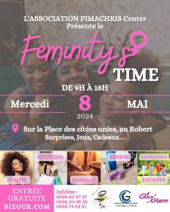 L'association PIMACHRIS CENTER présente le FEMINITY TIME mercredi 8 Mai 2024 de 8h à 18h sur la place des cités unies au Robert.
