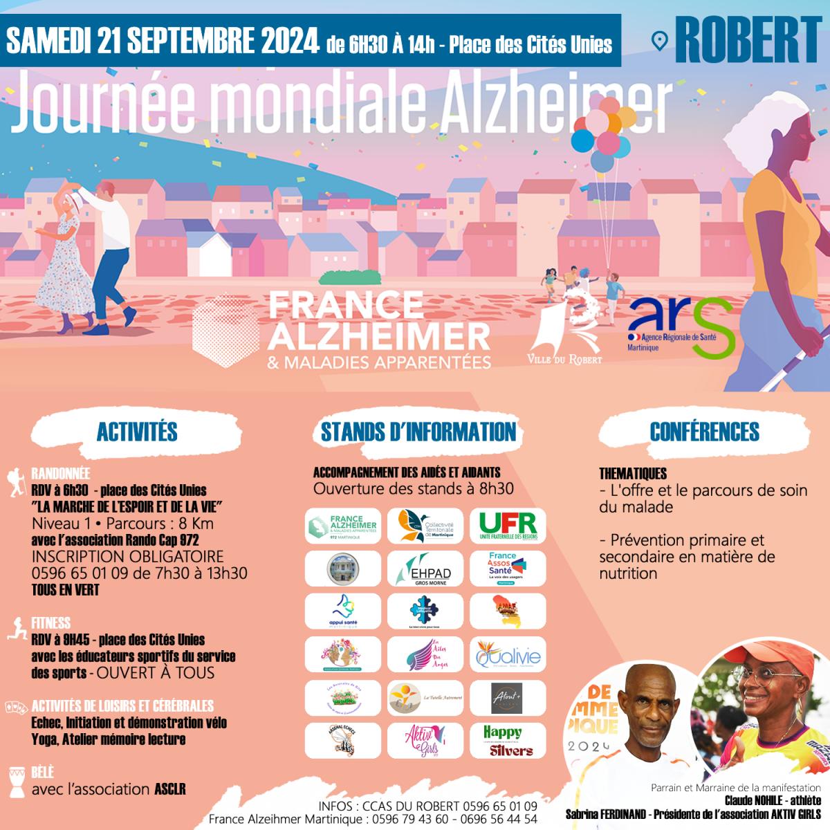 Dans le cadre de la journée mondiale de la maladie d'Alzheimer, le CCAS de la ville du Robert, l'association FRANCE ALZHEIMER MARTINIQUE et l'ARS, vous convient à participer aux activités et animations qui auront lieu Samedi 21 septembre 2024 sur la place des Cités Unies de 6h30 à 14h00.
