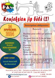 L'association LANBELI vous propose un atelier de KONFEKSION JIP BELE le samedi 24 février 2024 de 8h à 12h au local association de Monnérot au Robert.