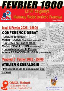 La présidente de l'Office Municipal de la Culture et des Loisirs du Robert vous invite à la deuxième édition de "LA VIL KA GLORIYÉ MANMAY WOBÈ TONBÉ O FRANSWA" jeudi 6 et vendredi 7 février 2025 à l'OMCLR Bd Henri Auzé.
