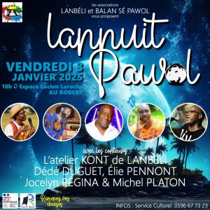 Les associations LANBELI et BALAN SE PAWOL en partenariat avec la DRAC et la ville du Robert vous invitent à la soirée culturelle LANNUIT PAWOL vendredi 3 janvier 2025 à partir de 18h30 à l’Espace Lucien LAROCHE avec les conteurs : L’atelier KONT de LANBELI, Dédé DUGUET, Elie PENNONT, Jocelyn REGINA et Michel PLATON