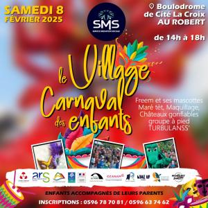 L'association SMS vous invite à participer au VILLAGE CARNAVAL DES ENFANTS le samedi 8 février 2025 de 14h à 18h au boulodrome de Cité La Croix.