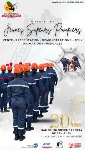 L'union des Sapeurs-pompiers de Martinique organise le samedi 30 novembre 2024 sur la Place du 22 Mai au Robert de 9h à 16h le Village des jeunes sapeurs-pompiers.