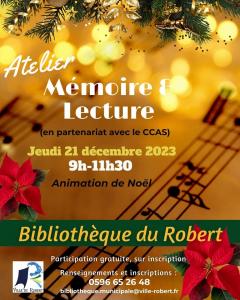 La Bibliothèque du Robert organisent en collaboration avec le CCAS un atelier "Mémoire et Lecture" et des animations de Noël le Jeudi 21 Décembre de 9h à 11h30.