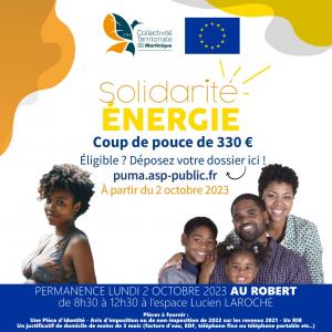 Dans un contexte de vie chère et face à l’augmentation des prix de l’énergie, la Collectivité Territoriale de Martinique met en place une aide de 330 € destinée aux familles vulnérables. Pour l’occasion, afin de faciliter le montage des dossiers, Le Maire vous informe qu’une permanence d’accompagnement se tiendra ce Lundi 02 Octobre de 8h30 à 12h30 à l’espace Lucien LAROCHE.