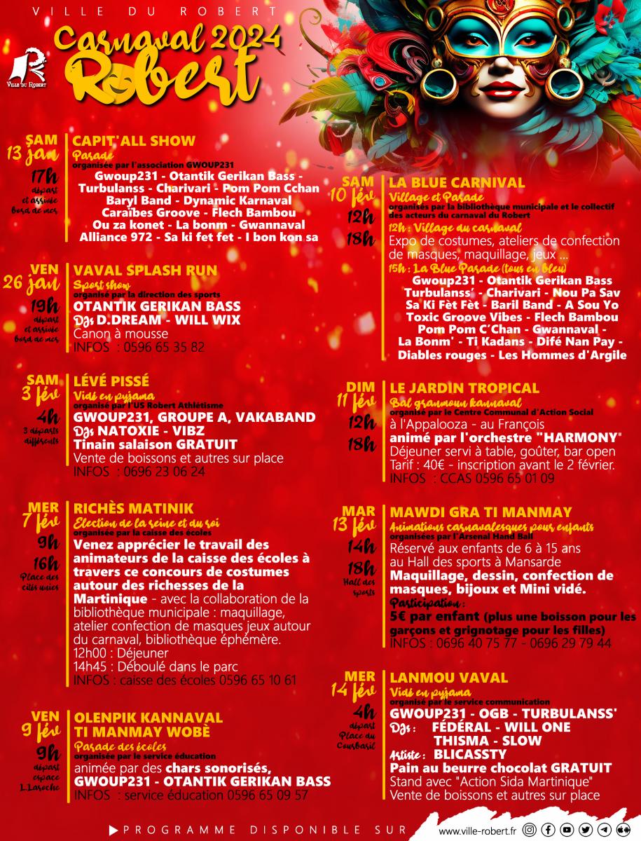 Participez aux manifestations carnavalesques de la ville du Robert du 13 janvier au 14 février 2024 :