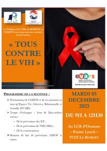 La politique de la ville du Robert et l'AMIOF vous proposent une matinée de prévention "TOUS CONTRE LE VIH" mardi 5 décembre 2023 de 9h à 12h30 au LCR d'Ozanam de Pointe Lynch