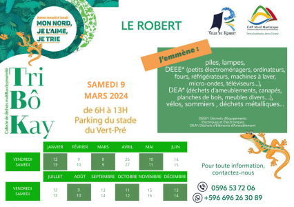 Afin de pallier au manque de déchèteries fixes existant sur le territoire martiniquais, Cap Nord et Seen Environnement ont décidé de créer une collecte multi-flux de déchets en apport volontaire, organisée tous les mois dans chacune des communes du Nord : Le Tri Bô Kay. Une équipe d'éco-animateurs se fera le plaisir d'accueillr et orienter les administrés sur le point de collecte.