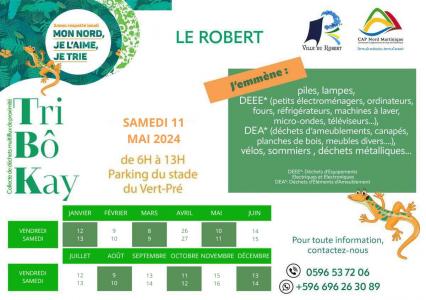 Afin de pallier au manque de déchèteries fixes existant sur le territoire martiniquais, Cap Nord et Seen Environnement ont décidé de créer une collecte multi-flux de déchets en apport volontaire, organisée tous les mois dans chacune des communes du Nord : Le Tri Bô Kay. Une équipe d'éco-animateurs se fera le plaisir d'accueillr et orienter les administrés sur le point de collecte.