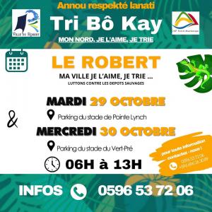 - MARDI 29 OCTOBRE de 6h à 13h sur le parking du plateau sportif de Pointe Lynch au Robert.