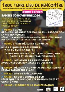 Dans le cadre de l'animation des quartiers prioritaires de la ville du Robert, l'association "LANMEN DAN LANMEN" organise la 5ème édition de "TROU TERRE LIEU DE RENCONTRE" le samedi 30 novembre 2024 à l'esplanade des arts de la culture et des traditions de Trou Terre à Cité La Croix