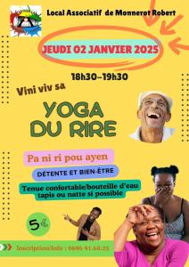 L'association LANBELI vous propose le "Yoga du Rire" (Pa ni ri pou ayen) le jeudi 2 janvier 2025 de 18h30 à 19h30 au local associatif de Monnérot.