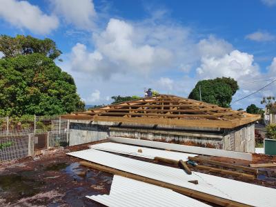 L'équipe de l'atelier bois s'affaire pour la construction de la toiture du nouveau siège de l'association AC Vert-Pré qui sera situé près de l'école primaire Occuline Amazan du Vert-Pré.
