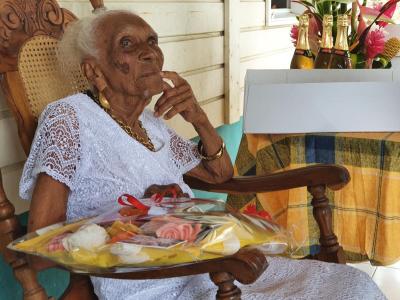 MME Vve BURNET née VERNEUIL SAINTE-LUCE Martiale Marcella fête aujourd'hui [mercredi 1 juillet 2020] ses 100 ans. Le Maire de la ville du Robert Alfred MONTHIEUX accompagné d'une délégation du CCAS s'est rendu à son domicile au quartier Moulin à Vent, pour lui remettre un présent. Mme Burnet a eu 8 enfants (un est décédé), 22 petits-enfants et 20 arrières petits-enfants.